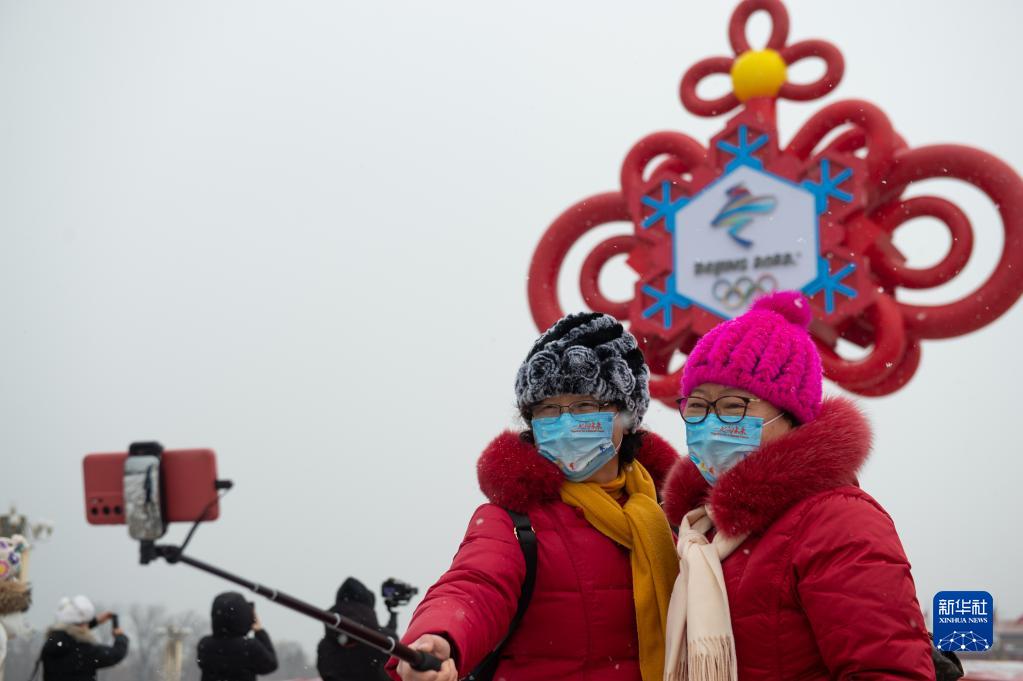 1月20日,游客在北京天安门广场“精彩冬奥”主题花坛前拍照留念。新华社记者 陈钟昊 摄