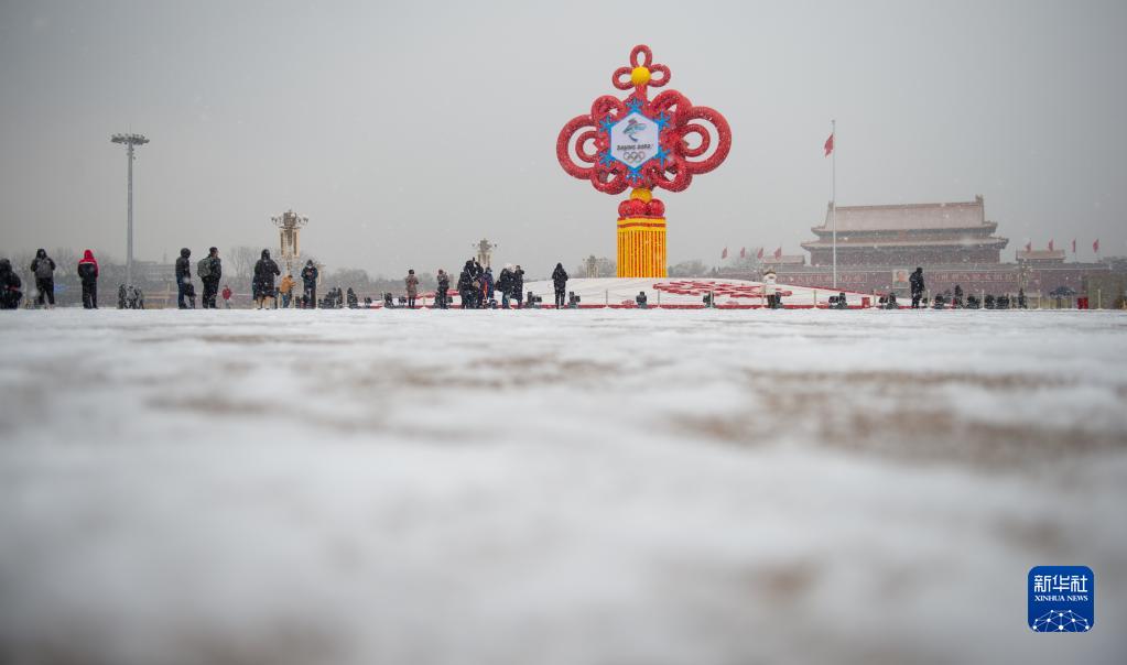 1月20日拍摄的北京天安门广场“精彩冬奥”主题花坛。当日是大寒节气,北京迎来降雪。新华社记者 陈钟昊 摄