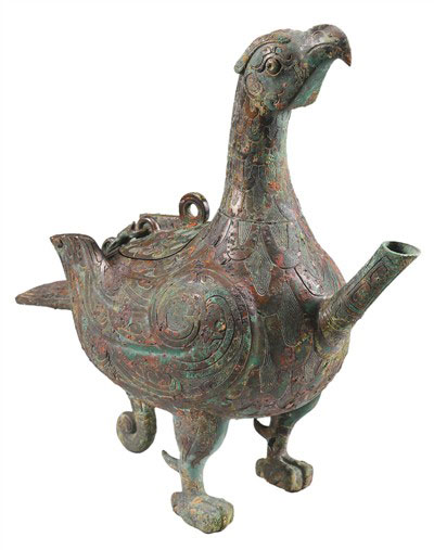 霸国墓地出土的铜鸟盉造型奇特,通体布满精美纹饰。铜鸟胸腹部向前斜伸一管状长流,尾下腹底有一象首足,象鼻外卷。铜鸟背部有盖,盖内刻51字铭文。有专家认为它是酒器,也有学者根据与它一同出土的铜盘推测,它们是古代贵族在祭祀、宴饮等场合用来洗手的器具。