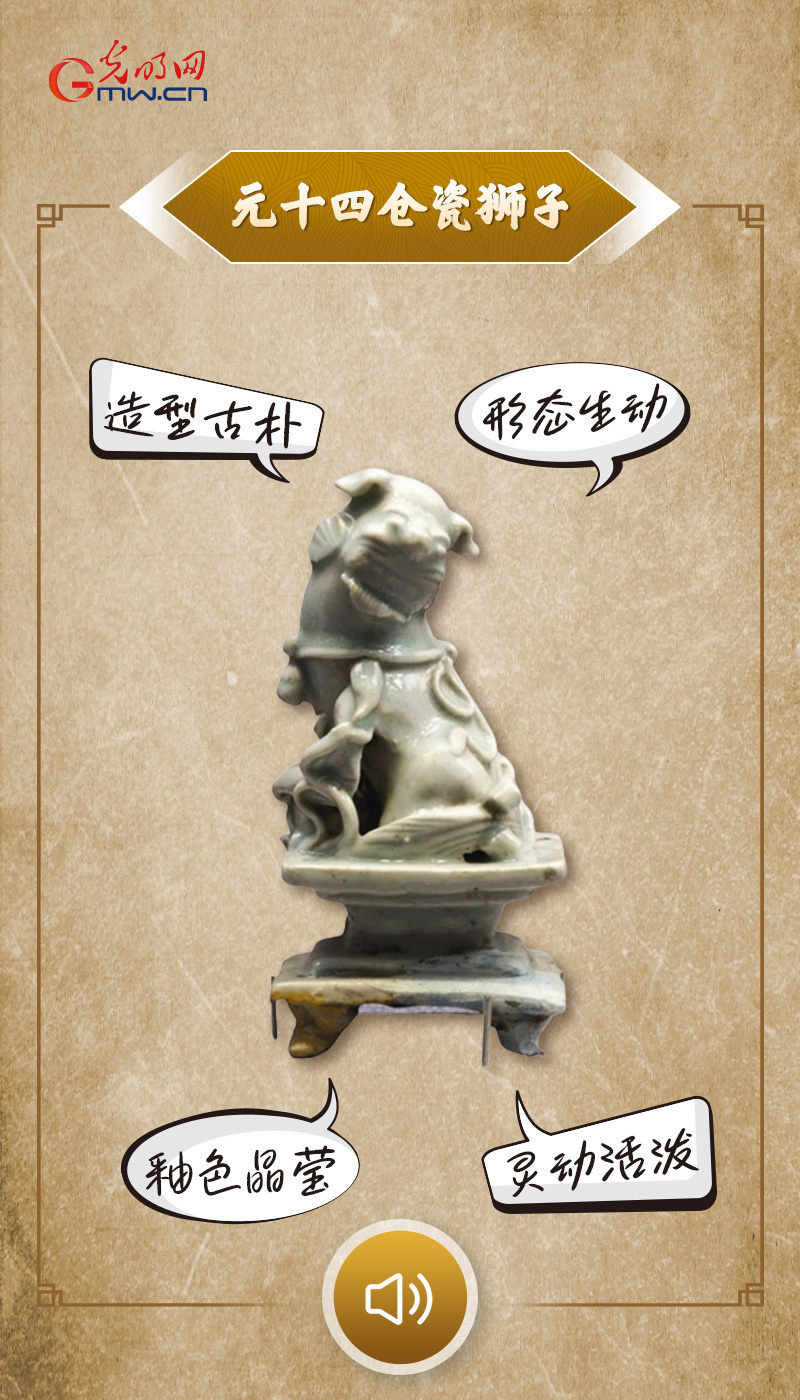 元十四仓瓷狮子出土于天津市十四仓遗址,现藏于天津博物馆。狮子釉色在青白之间,脖子上佩戴项圈,下坠铜铃和红缨,身后有从项圈垂下的绶带,看上去格外乖巧可爱。