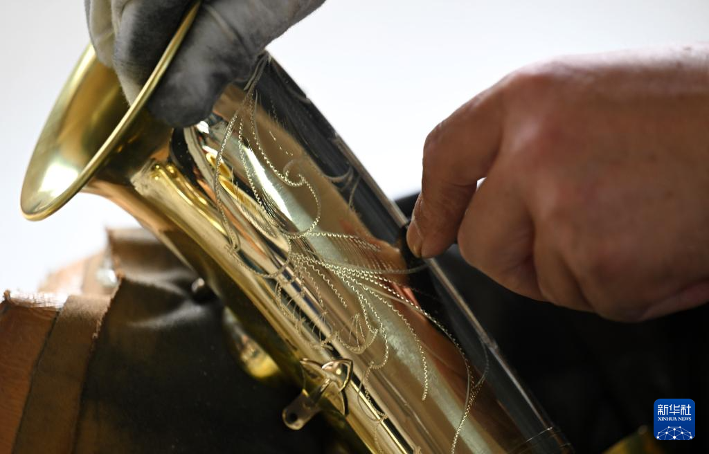 8月13日,在天津圣乐乐器有限公司,工作人员在生产车间对一款乐器进行雕花。