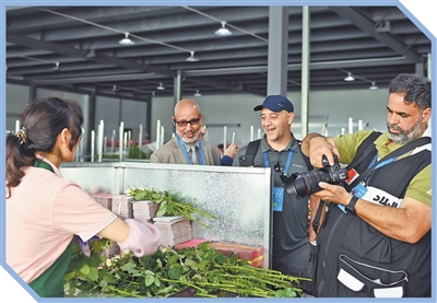 2025“一带一路”媒体合作论坛联合采访团成员在云南昆明参观绿色高效花卉生产示范基地。