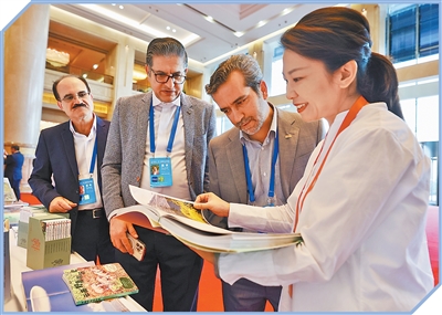 2025“一带一路”媒体合作论坛主会场,与会嘉宾通过书籍了解云南省情。