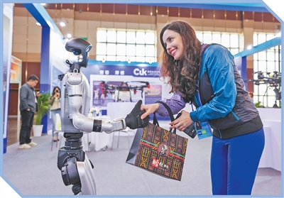 2025“一带一路”媒体合作论坛联合采访团成员与机器人互动。