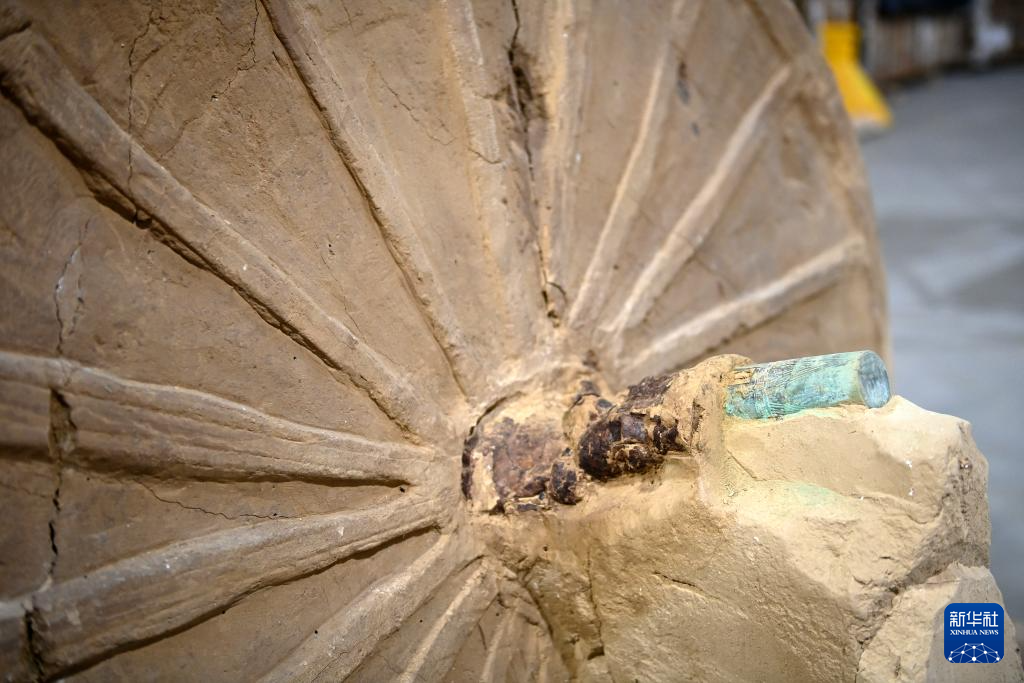 12月12日在陕西省考古研究院文物保护实验室拍摄的瓦窑沟墓地M3号墓出土双辕车(局部)。