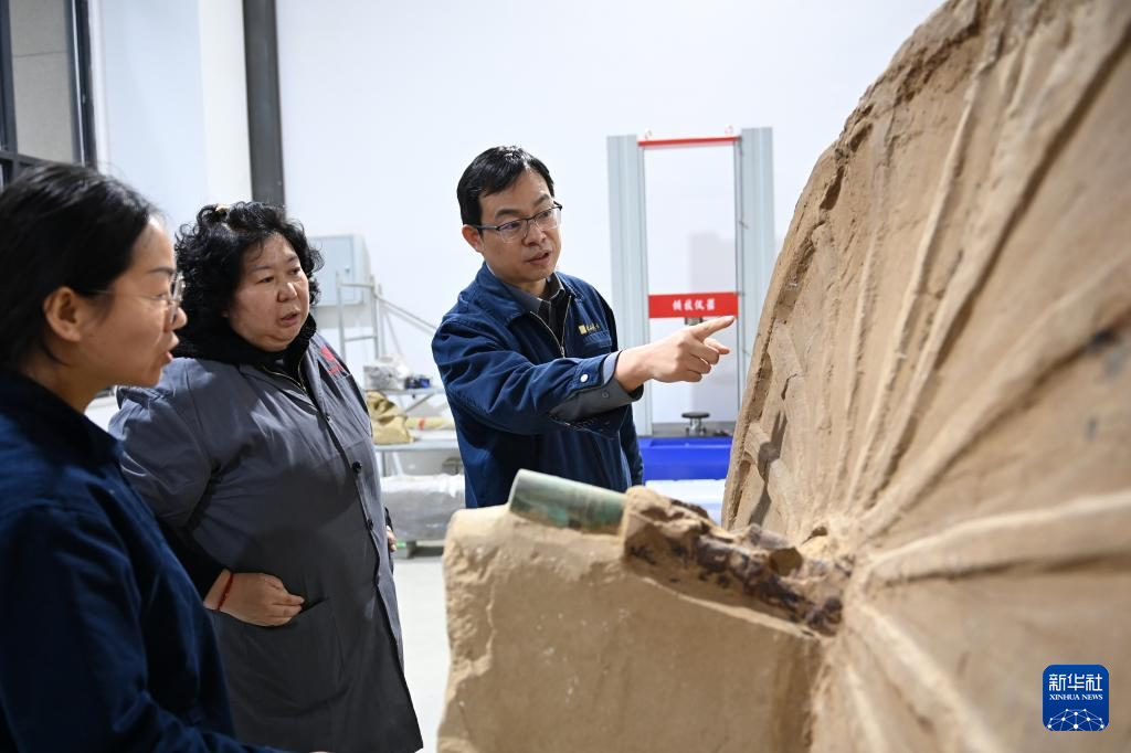 12月12日,寨沟遗址考古队负责人孙战伟(右)和同事们在陕西省考古研究院文物保护实验室讨论瓦窑沟墓地出土的双辕车清理修复情况。