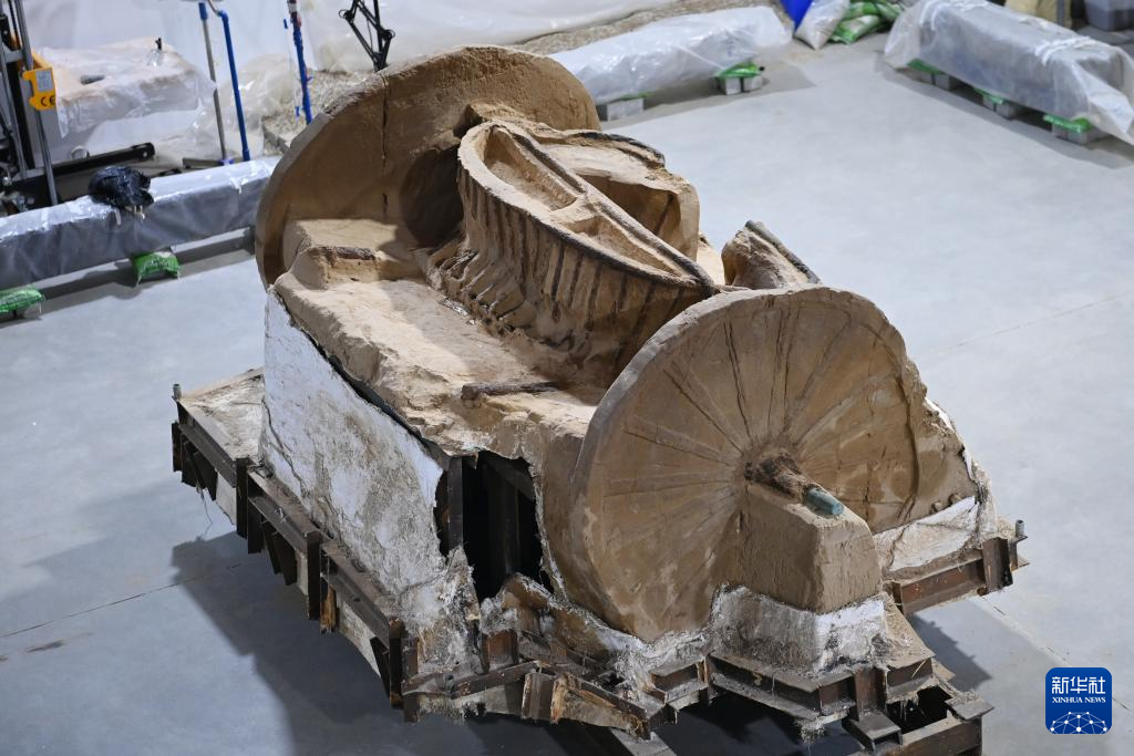 12月12日在陕西省考古研究院文物保护实验室拍摄的瓦窑沟墓地M3号墓出土双辕车。