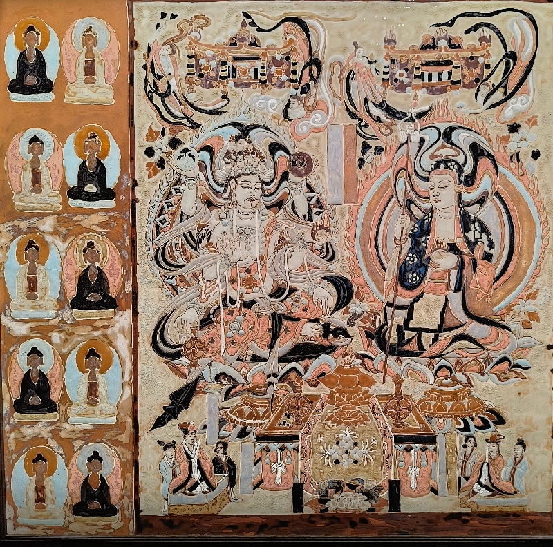 敦煌莫高窟第328窟(官方复制窟)同比例复制的8件唐代彩塑,人物惟妙惟肖,完整保留了初唐佛像的丰腴造型与彩绘纹样,使观众仿佛置身莫高窟,真切感受到敦煌艺术的魅力。《千手千眼观音》《普贤将军罐》等作品,则运用了青花、五彩、斗彩、古彩等技艺,将敦煌壁画中佛教尊像画、经变画、佛教故事画、装饰图案等的斑驳肌理与神秘色彩凝固定格,釉色的流淌交融间,实现了古典美学与现代工艺的完美融合。