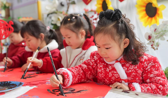 12月29日,贵州省贵阳市开阳县第二幼儿园的小朋友书写“福”字迎接新年。