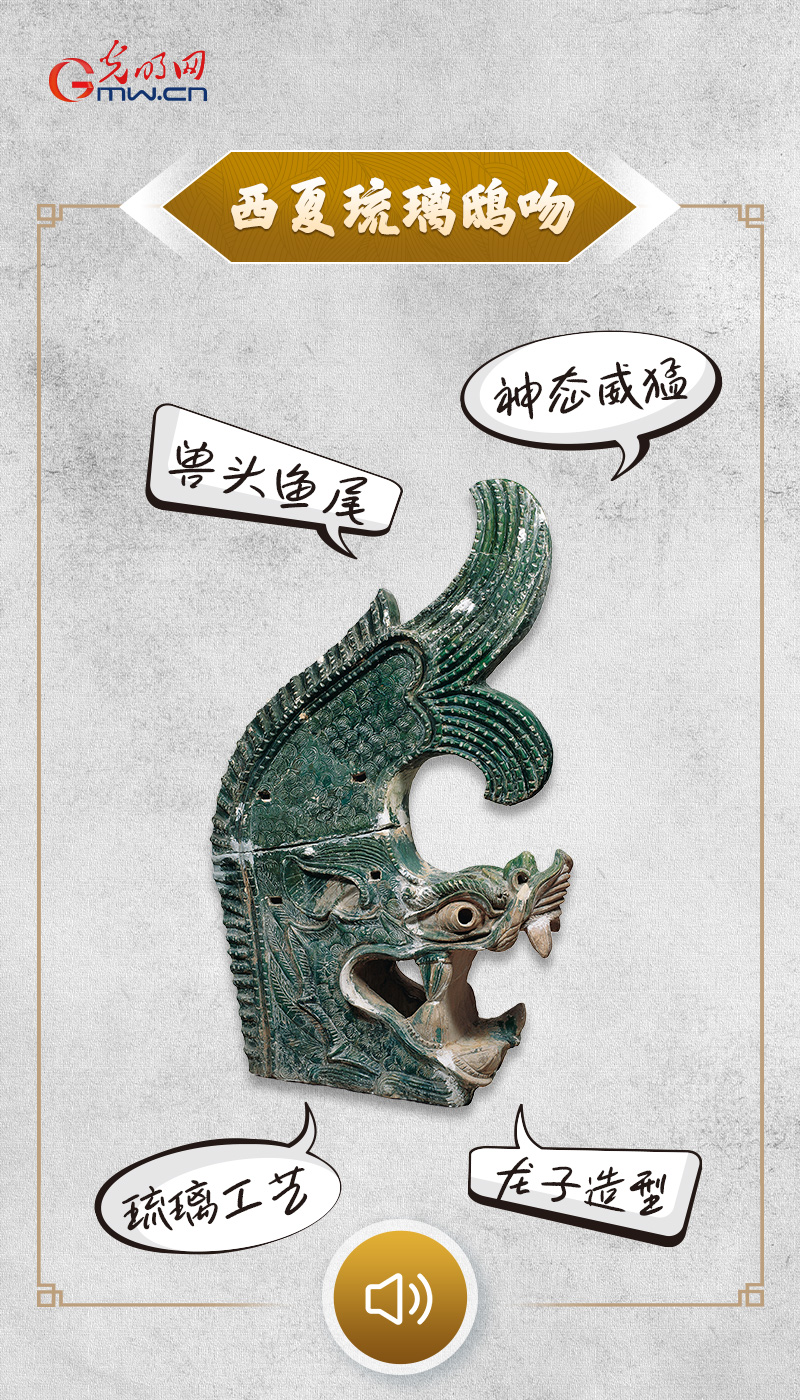 “相传‘龙生九子,各有所好’。我便是其中之一,名为鸱吻,擅吞火降雨,因此自古便被安置于宫殿庙宇的屋脊上,既为建筑增添守护之意,也寄托着人们辟火消灾、祈求平安的愿望。在我所属的西夏王朝,琉璃制品工艺珍贵,通常仅为皇室专用。以我这样的形制与尺寸,也唯有在宏伟的皇家殿宇之上,方能与之相称。如今朝代更迭,但当我静静立于此处,是否也能让你想到当年这座陵园有着怎样庄严恢弘的景象。”