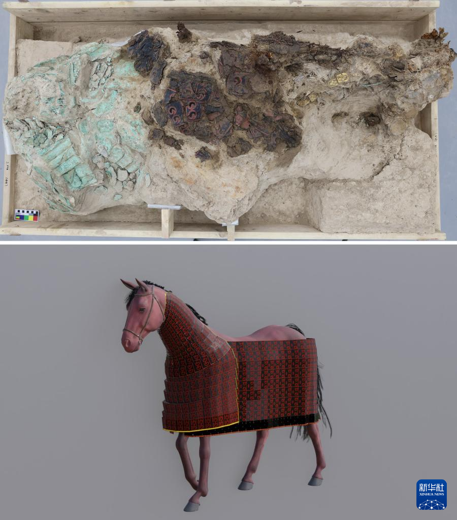 拼版照片:上图为由青海都兰热水墓群2018血渭一号墓经套箱提取修复前的唐代髹漆马铠甲;下图为经研究后运用数字技术复原的唐代髹漆马铠甲示意图。