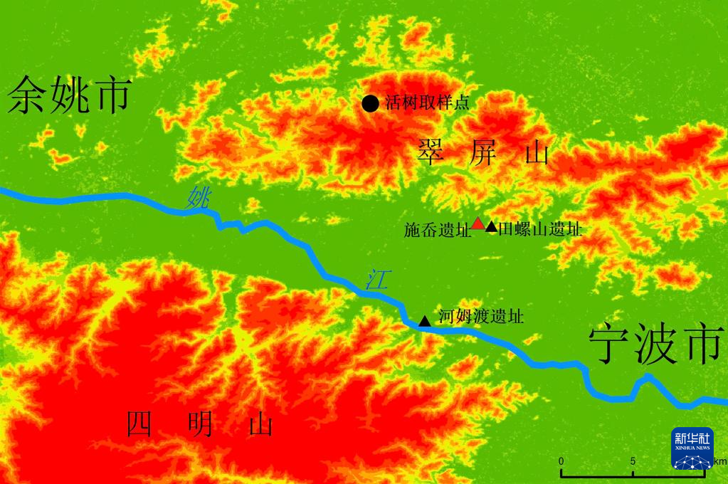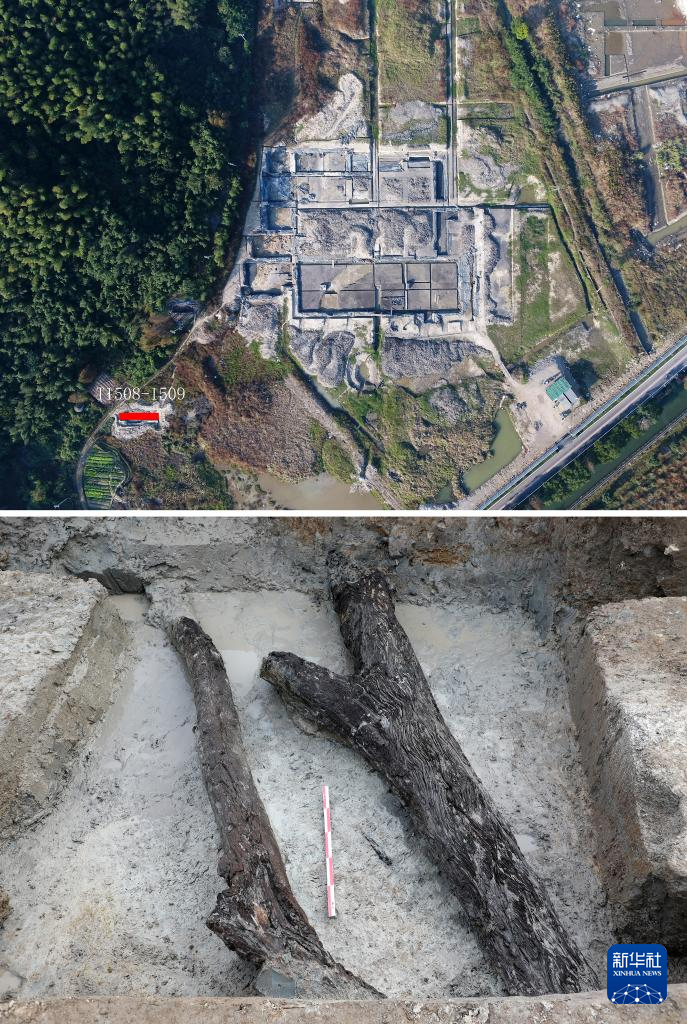 拼版照片:上图为浙江施岙遗址出土良渚文化时期杨梅古树遗存的探沟位置(标红);下图为施岙遗址杨梅古树遗存出土现场(资料照片)。