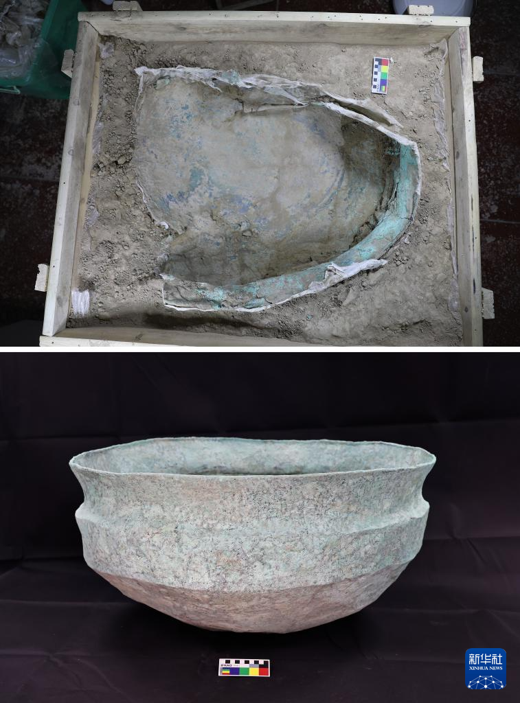 拼版照片:上图为由青海都兰热水墓群2018血渭一号墓经套箱提取修复前的铜釜;下图为经科学保护修复后的铜釜(资料照片)。