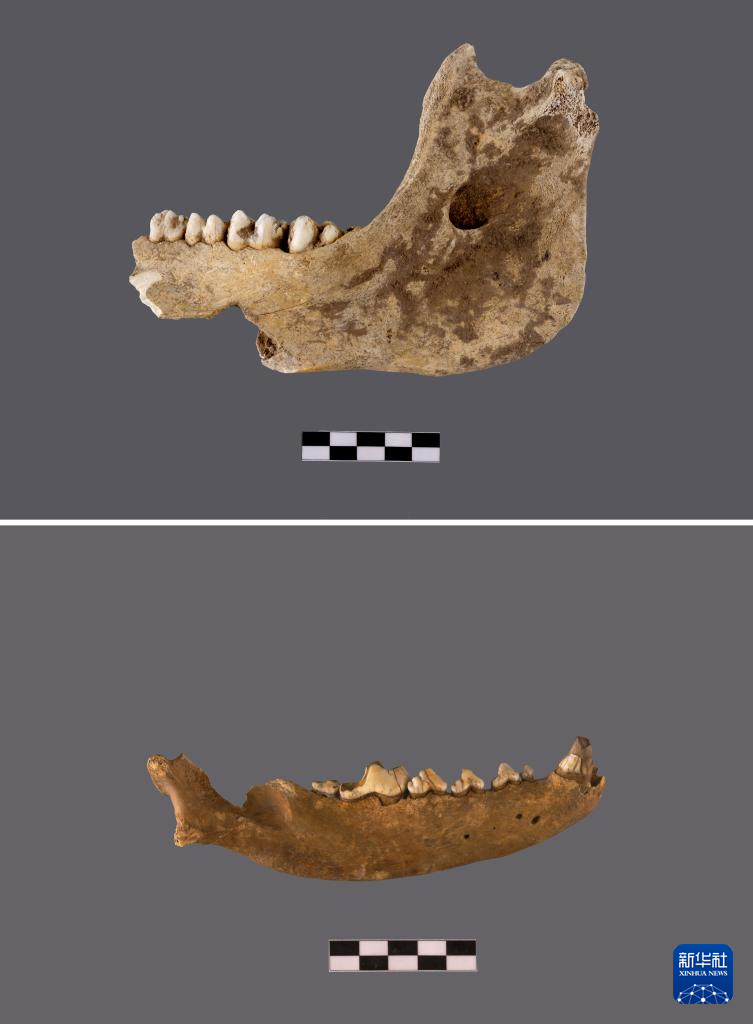 拼版照片:上图为现藏于中国古代动物标本库中的出土于河南贾湖遗址中的中国最早家猪骨骼标本;下图为出土于河北南庄头遗址的中国最早家犬标本(资料照片)。