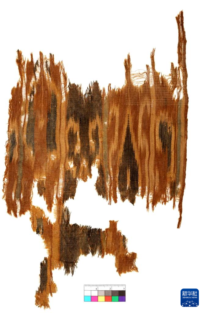 青海都兰热水墓群2018血渭一号墓出土的扎经染色织物实物图(资料照片)。