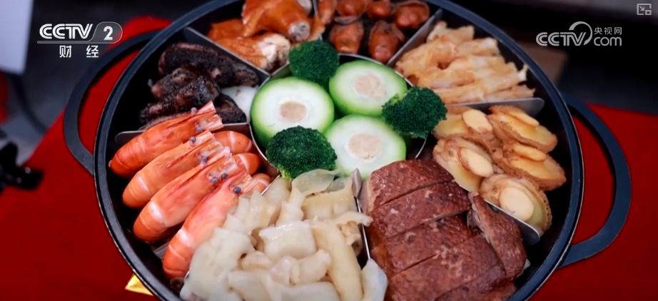 吉市一开,热气腾腾的年味便扑面而来。美食区里,寓意“团团圆圆”的盆菜礼盒、丰盛的九大簋,这些承载着记忆的传统佳肴率先吸引食客目光。