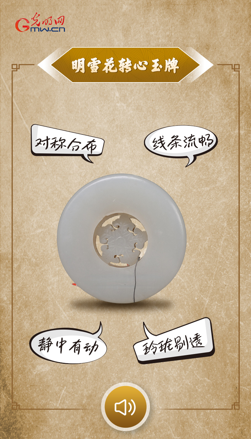 明雪花转心玉牌现藏于陕西历史博物馆,直径4.3cm,重0.025kg。这件透雕玉牌,中间有可转动的雪花形玉饰,古朴又不失灵动,展现了明代匠人对镂空雕刻等玉雕技法的精湛掌握。