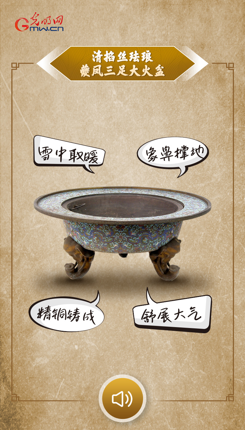 清掐丝珐琅夔凤三足大火盆现藏于沈阳故宫博物院,为清中期宫内取暖实用器具,成对陈设。此盆为圆形口,口沿为宽板沿外折,下部为鼓腹,底部有象首形三足。全器以掐丝珐琅制成,均为浅蓝色珐琅釉地,板沿及腹身皆饰蓝色夔凤纹及繁密的绿、蓝、粉、黄色缠枝花纹,个别纹饰有填白,增加了图案的美感;盆口沿边缘錾刻一圈回纹,因常年使用鎏金已失;腹下部有鎏金三象首形足,象耳下垂,双牙直伸,象鼻子触地向上卷曲;盆内另附盛炭之器,为脸盆形状,内沿安有两个活环,以方便取用。此件珐琅火盆为宫廷里冬季取暖之器,集实用与美观于一体,反映了北方宫廷生活的状况。