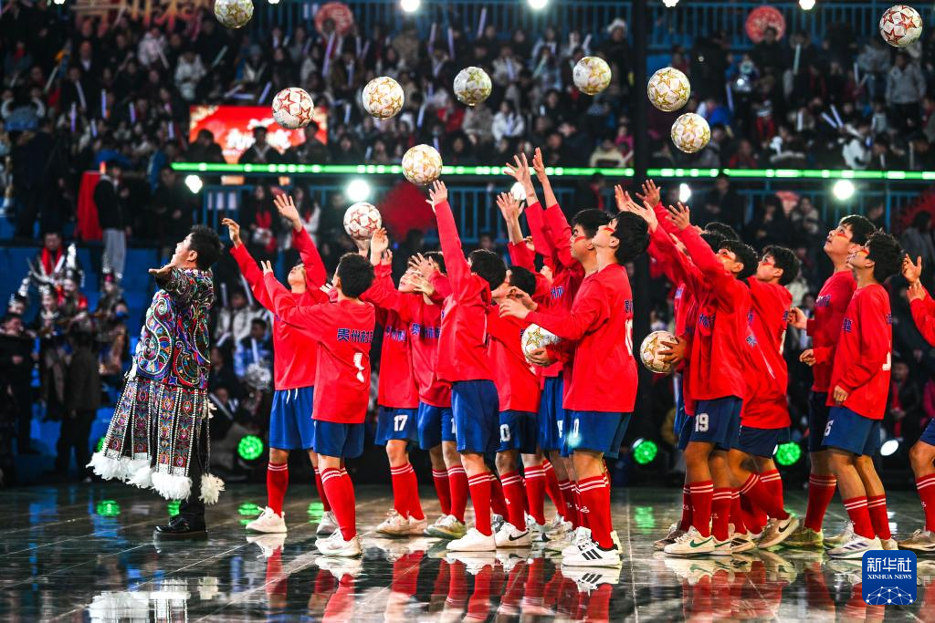 2月3日,孩子们在2026贵州“村晚”现场表演“村超”节目。