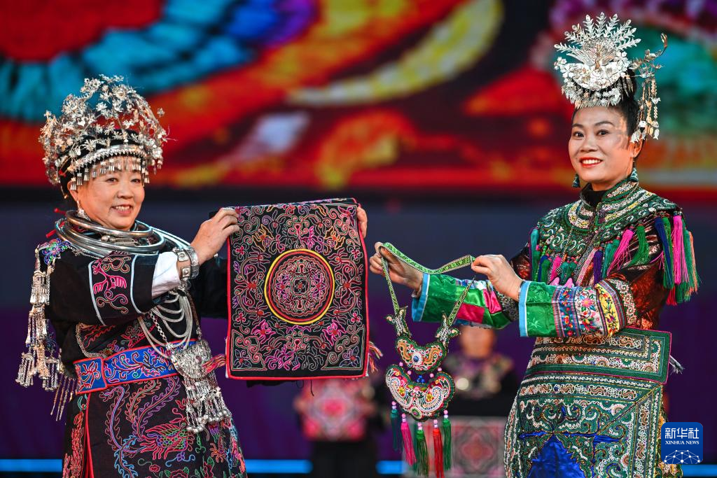 2月3日,村民在2026贵州“村晚”现场展示民族刺绣。