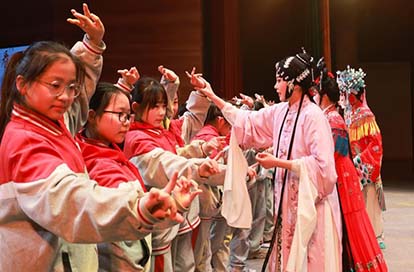 江苏省宿迁市沭阳县实验小学的学生来到县文化馆,通过学习淮海戏知识、参观服饰、道具以及与淮海戏演员互动,模仿唱腔、动作等,沉浸式体验淮海戏文化