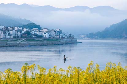 随着气温回暖,安徽省黄山市歙县深渡镇漳潭村新安江畔的油菜花进入渐次绽放,金灿灿的花海绵延起伏,与粉墙黛瓦的古村落交相辉映,构成一幅春意盎然的江南水乡画卷,令人陶醉