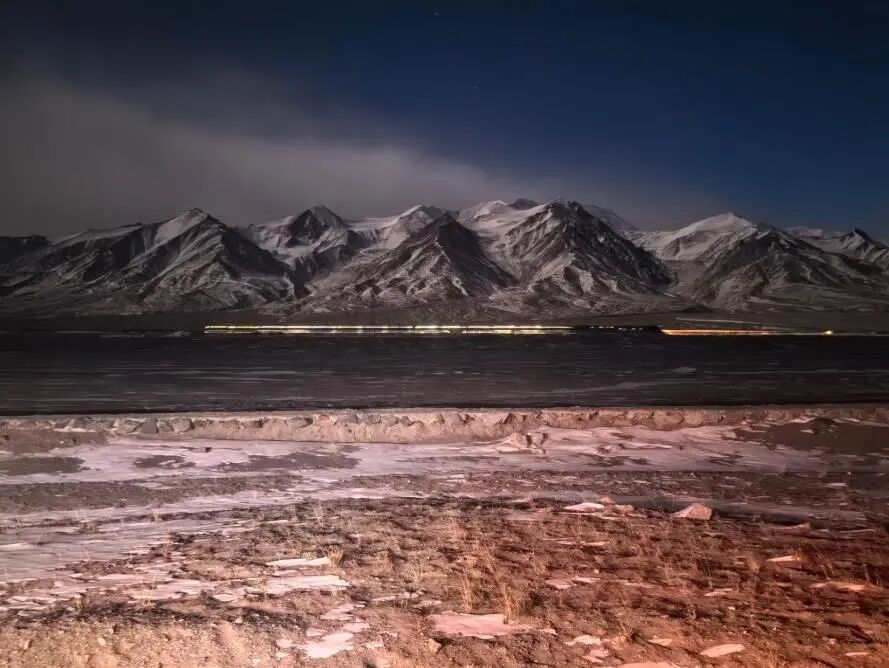 夜幕低垂,玉珠峰在深蓝的天幕下沉默矗立,冷峻的轮廓被月光与星光勾勒得愈发清晰。山脚下,列车划破沉寂,如一条金色的光带在冻土上蜿蜒穿行,明亮的车灯与车厢灯火,在冰封大地上拖曳出流动的光痕。